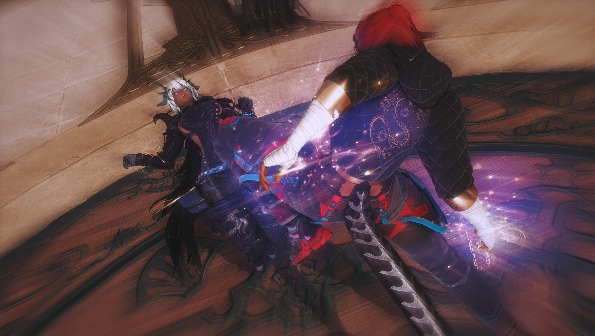 They both hit the ground—roll—spring apart—then charge one last time.Their final clash stops inches short of catastrophe, fists locked together, aether roaring between them like a living thing.“Enough,” Y’shtola says calmly—but with authority—as she is clapping once.The aether disperses.Aldra exhales slowly, her transformations settling—not fading, but stabilizing, as if her body has accepted a new truth. Gek straightens, stretching her neck with a satisfied groan.