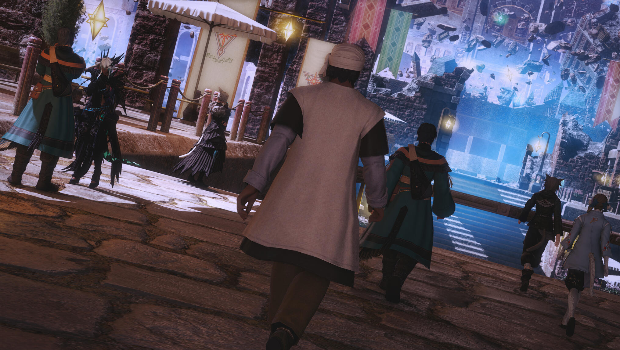 The ache of exertion still lingered faintly in Aldra’s muscles as she and Y’shtola stepped into Jeuno, the port city unfolding before them in impossible layers. The spar with Gek had grounded her—reminded her of balance, restraint, and the steady discipline she had honed—but Jeuno demanded a different kind of awareness altogether. The moment her boots met the stone, Aldra felt it: aether not raging or corrupted, but rearranged, as though the city itself breathed according to rules written elsewhere.Above the cerulean waters, shattered arches and fragments of ancient walls hovered in suspended silence. They did not drift nor tremble; they simply were, held aloft by an unseen will that asked no questions of gravity. The air carried a low, constant hum, a resonance that brushed against Aldra’s senses like a held note—calm, sustained, and deliberate. It was not unpleasant. If anything, it was soothing, like standing within the slow pulse of a living heart.What struck her most was how little anyone seemed to notice.Merchants hawked their wares from sun-warmed stalls, banners fluttered lazily between stone pillars, and sailors shouted greetings across the docks as if the sky were not littered with the bones of a ruined city. Children laughed, guards patrolled, and life moved forward with practiced ease. To the people of Jeuno, the impossible had long since become mundane.