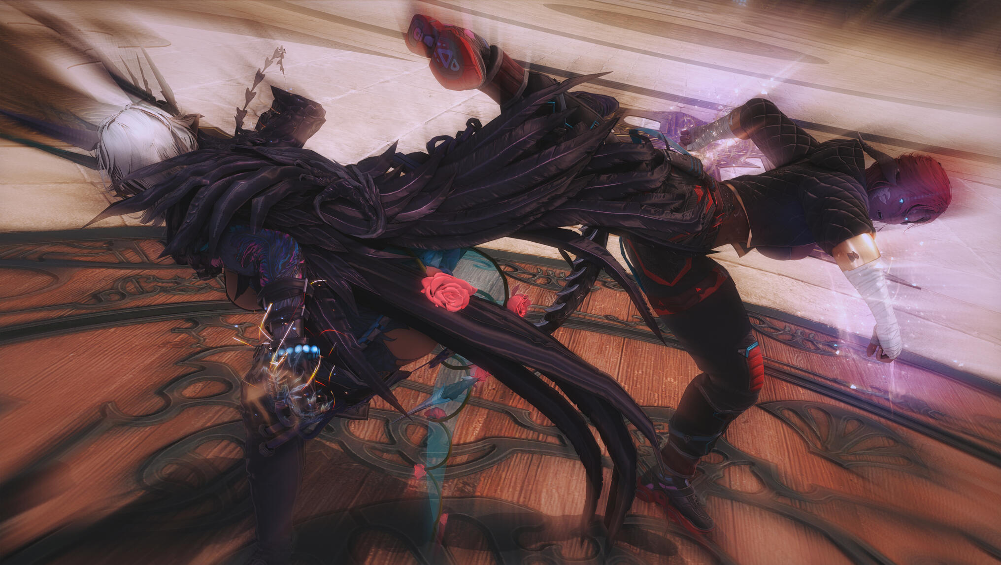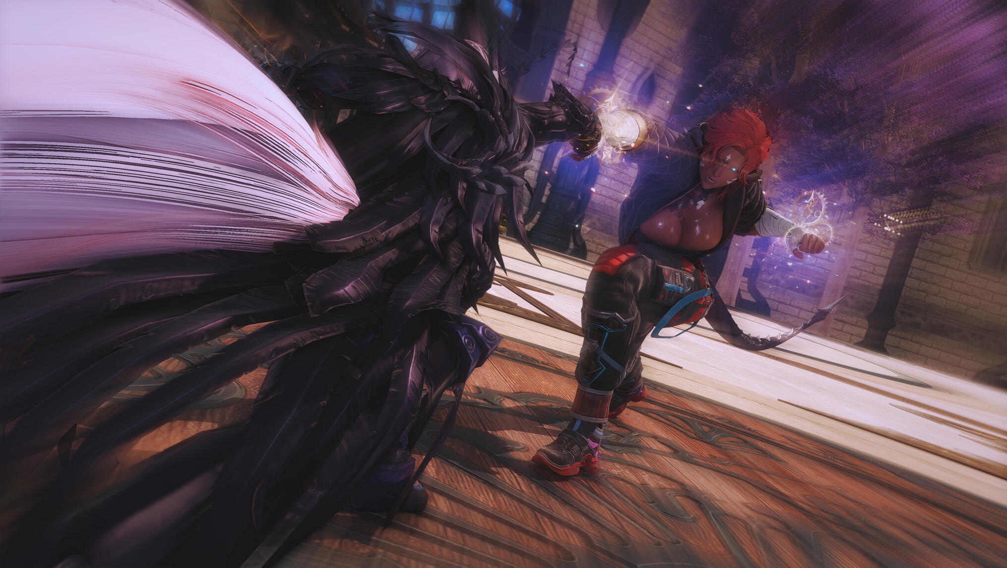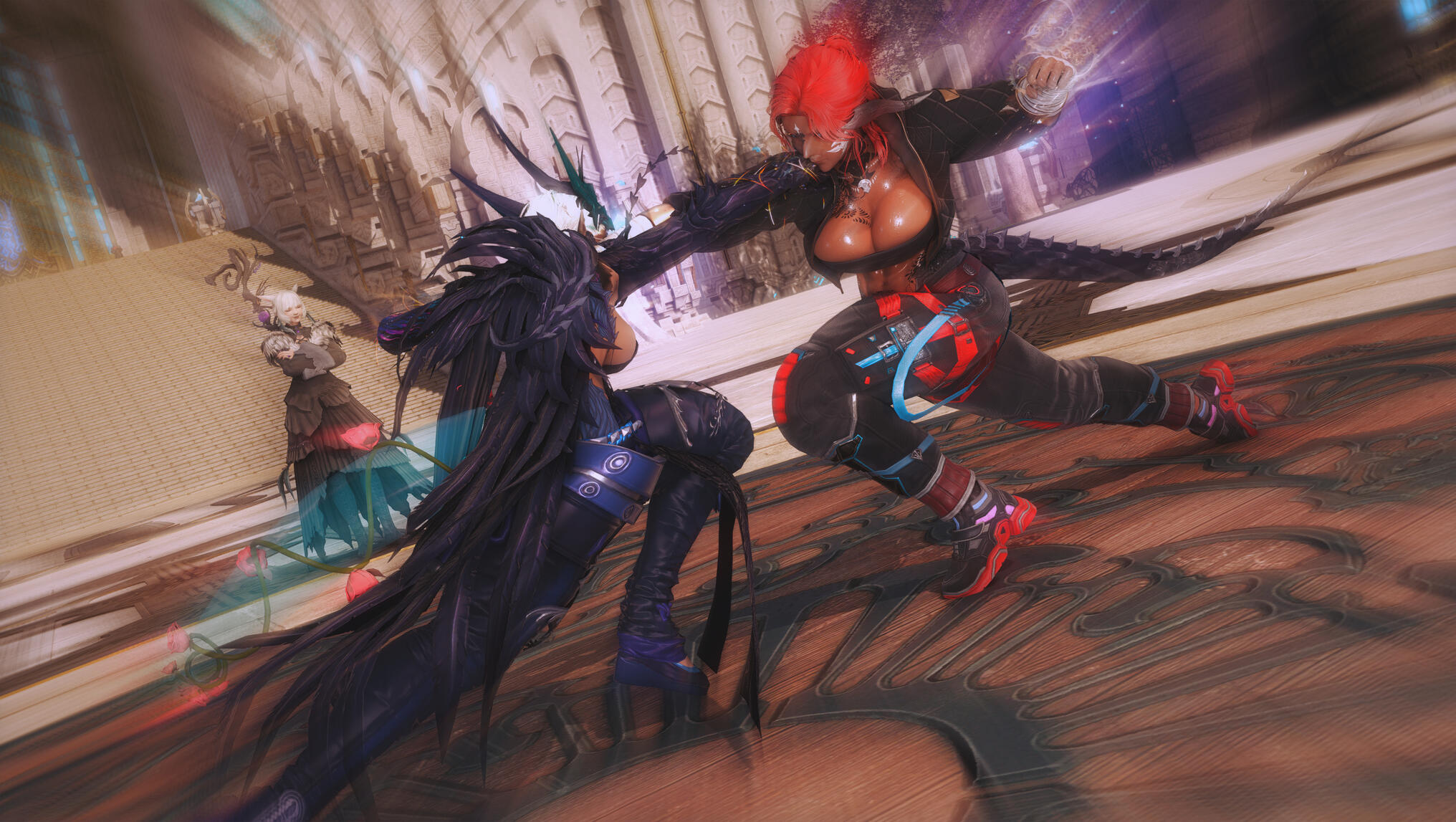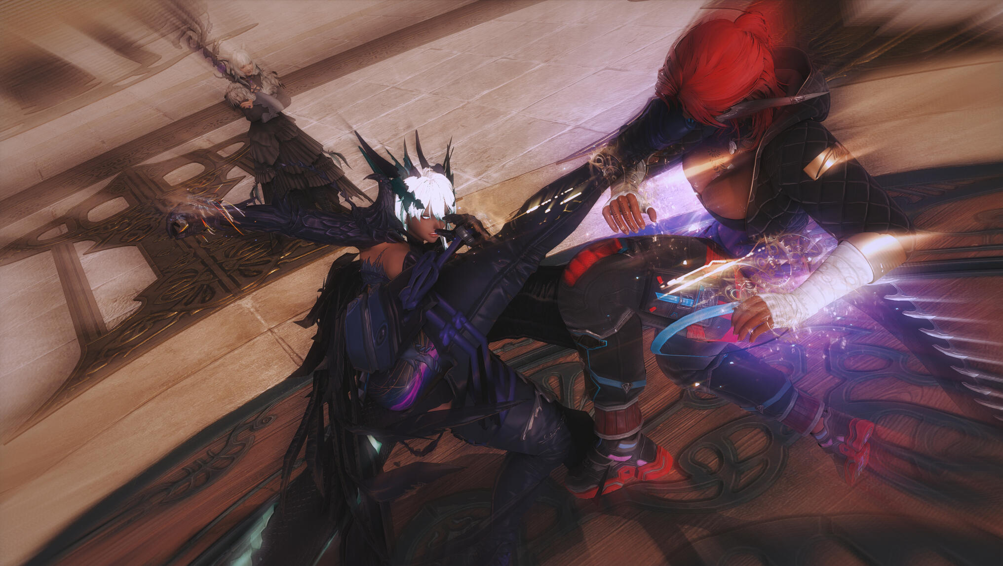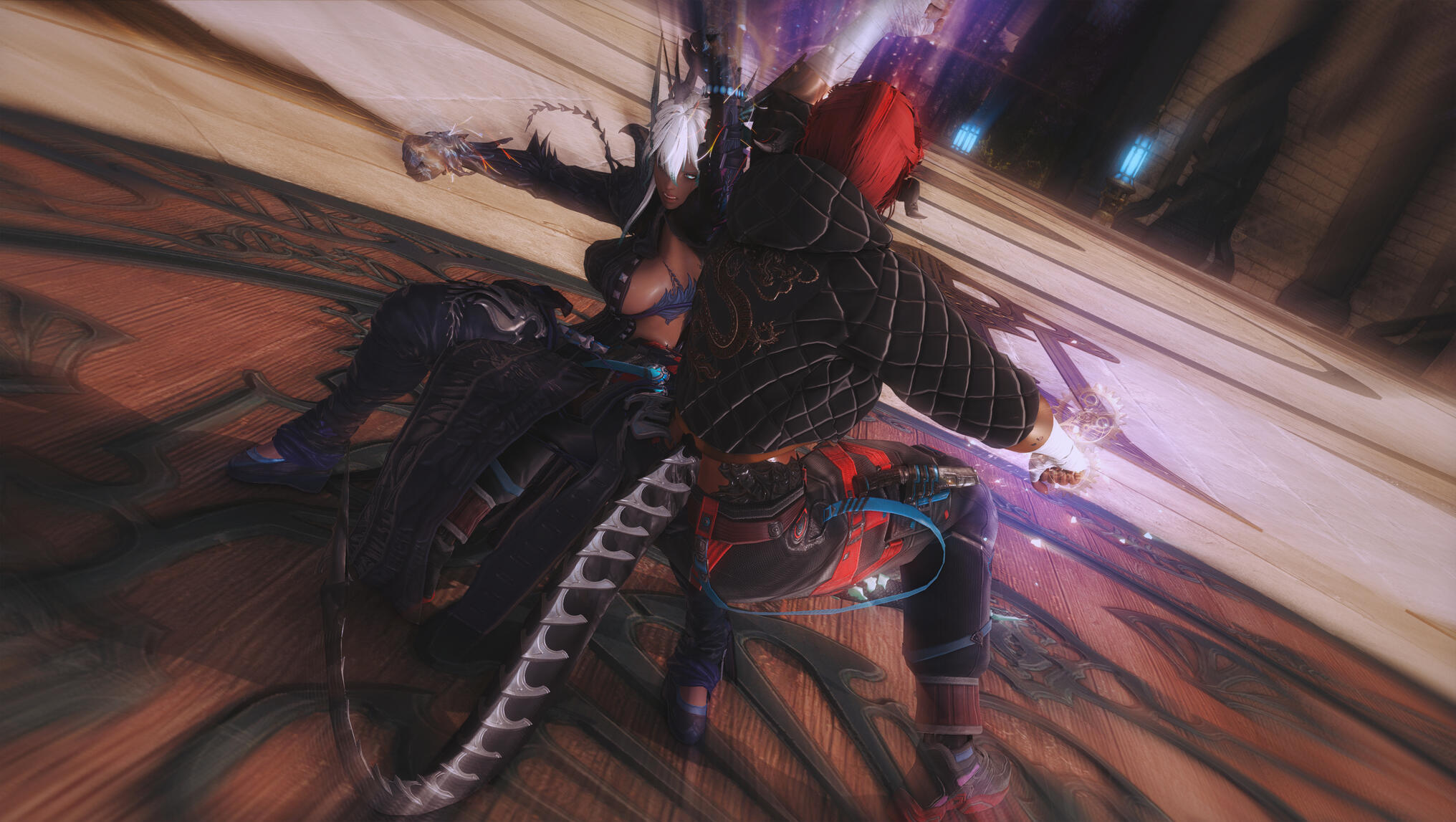 They both hit the ground—roll—spring apart—then charge one last time.Their final clash stops inches short of catastrophe, fists locked together, aether roaring between them like a living thing.“Enough,” Y’shtola says calmly—but with authority—as she is clapping once.The aether disperses.Aldra exhales slowly, her transformations settling—not fading, but stabilizing, as if her body has accepted a new truth. Gek straightens, stretching her neck with a satisfied groan.