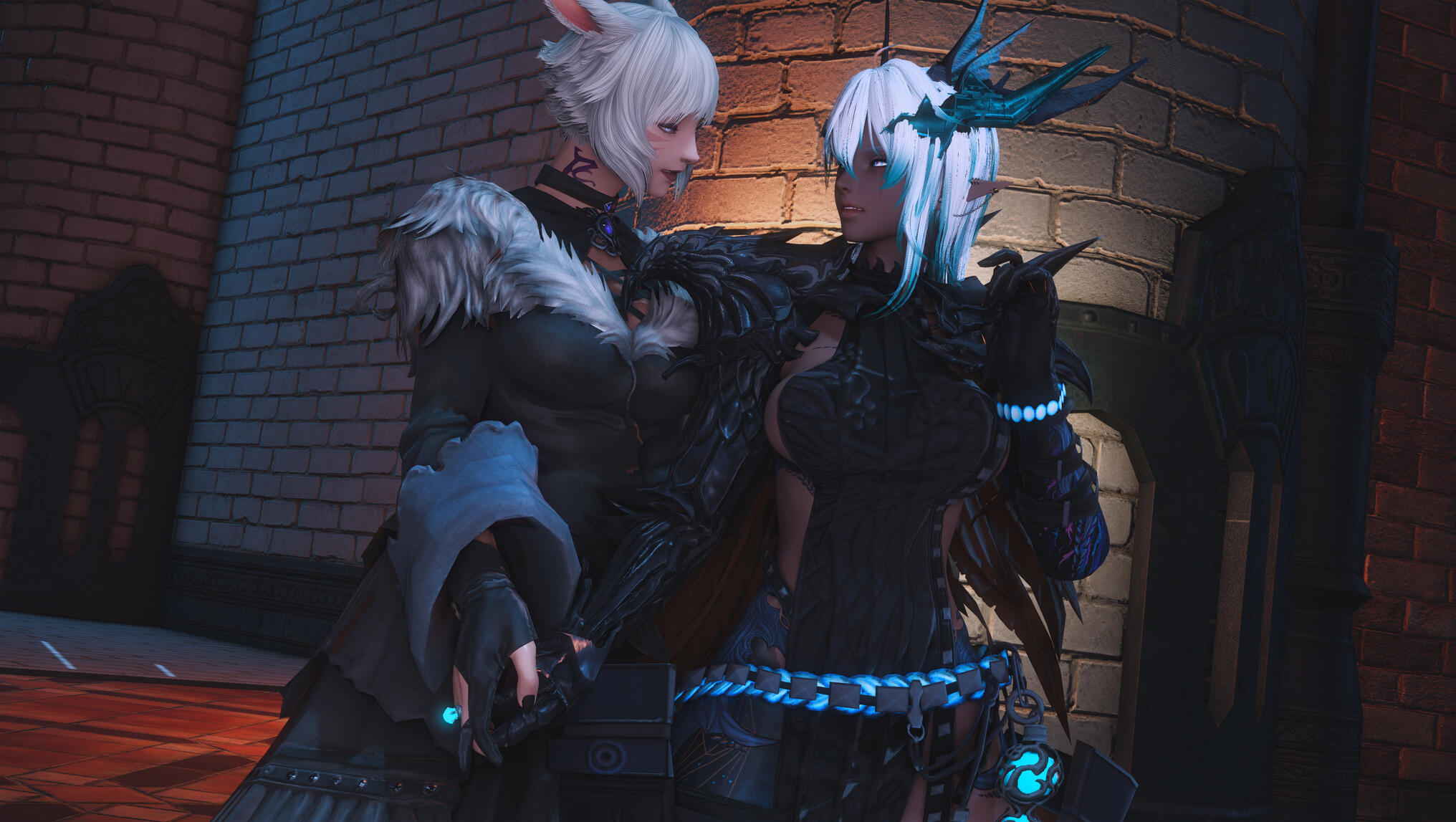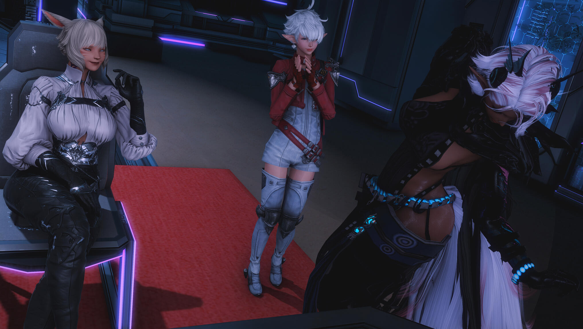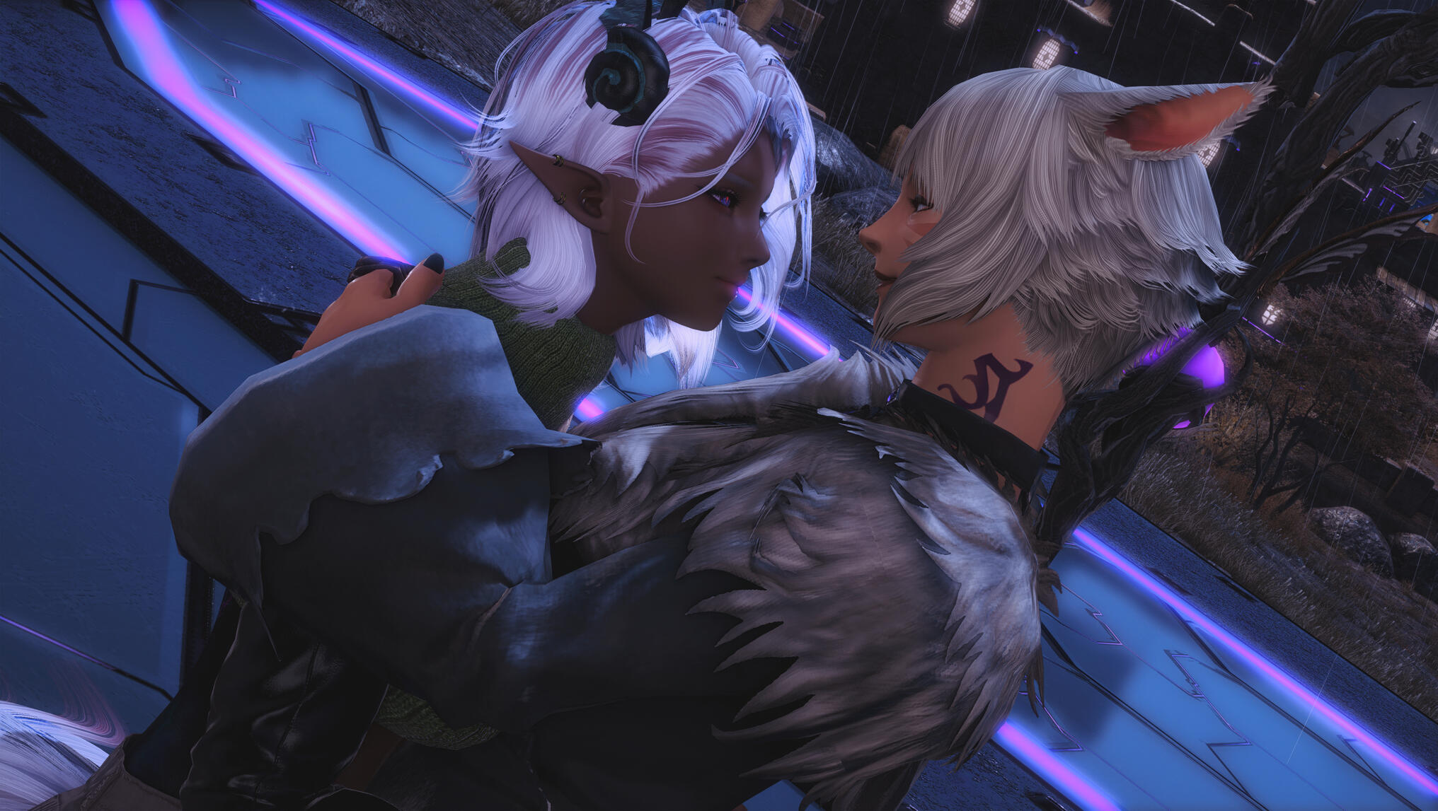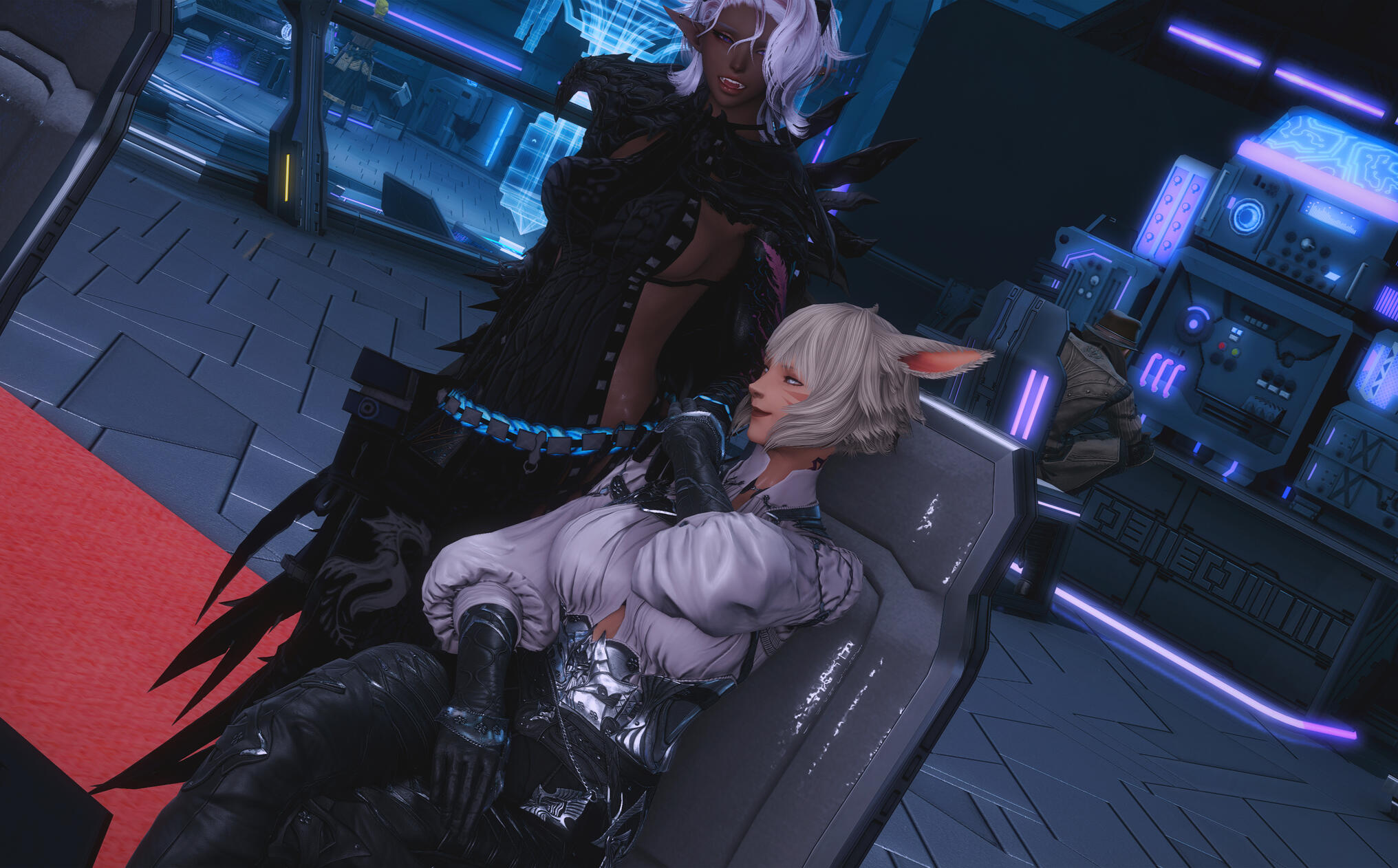 The next morning in Solution 9 dawned with a glittering neon haze, soft and slow, as though even the lights themselves knew what kind of night Aldra and Y’shtola had shared. Their clothing, torn and frayed from the frantic chase that had once been driven by obsession and fear, now served as reminders of a journey that ended not in ruin, but in clarity… and vows. Alisaie didn’t miss it. Alphinaud certainly didn’t.Still, Aldra walked with her head high, her tail brushing lightly behind her, and one hand resting at the small of Y’shtola’s back—protective, steady, proud. Y’shtola, in turn, stayed close, the faintest, satisfied curve to her lips, the kind that made Alisaie sigh through her nose but couldn’t quite scold. Not today.They stepped into the backroom of the Neon Stein, greeted at once by Alisaie. Alphinaud stood beside her, arms folded, his expression caught between relief and lingering distrust as he questioned Y’shtola about her motives—what, exactly, had made her so fixated on Aldra.Y’shtola lifted her chin.
