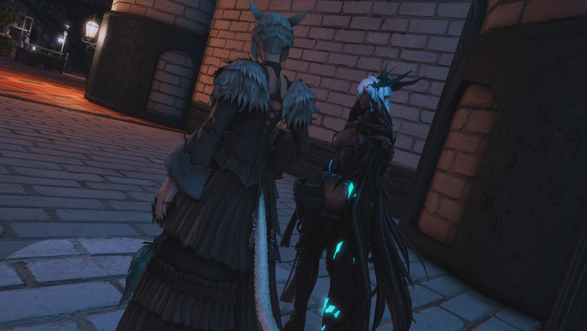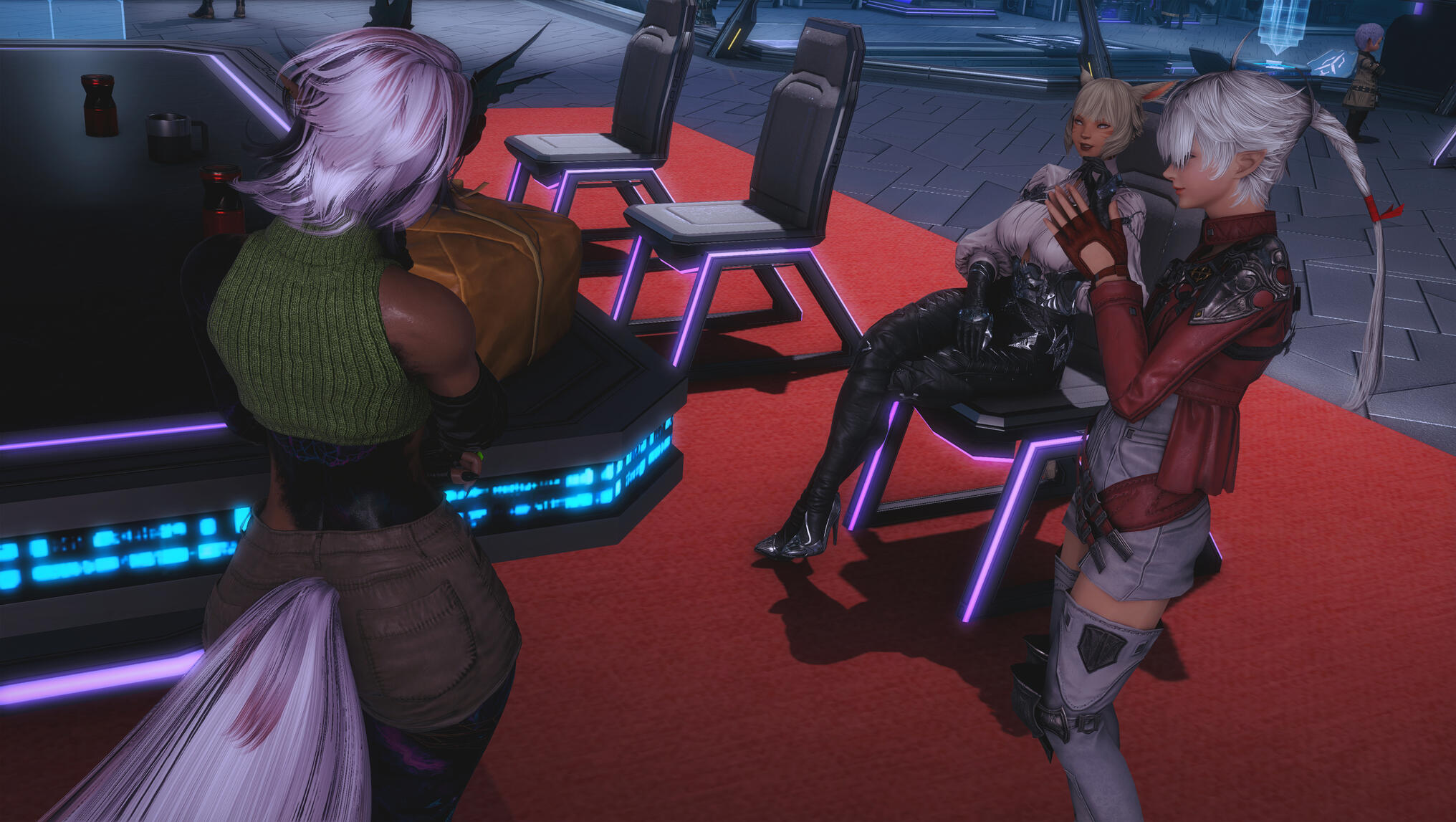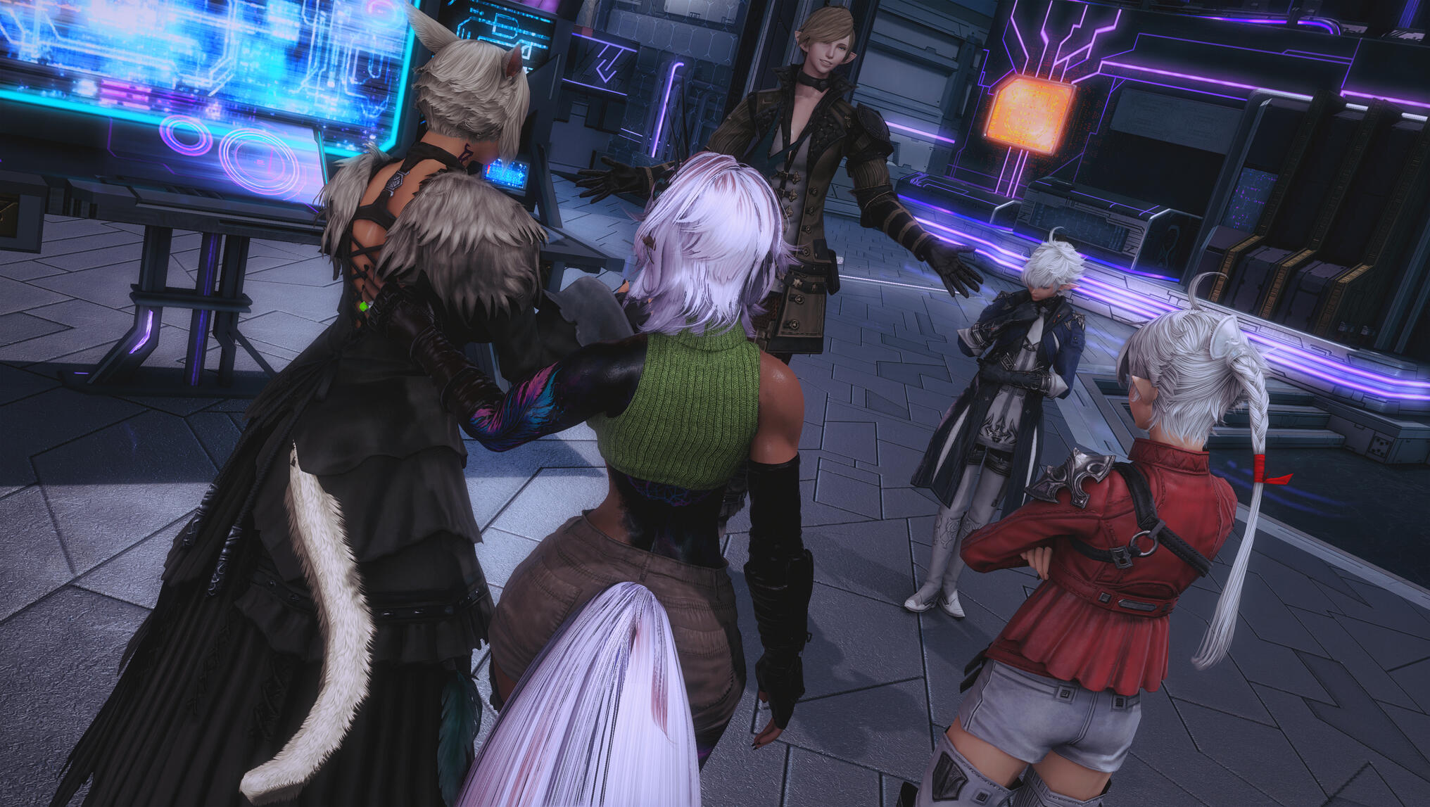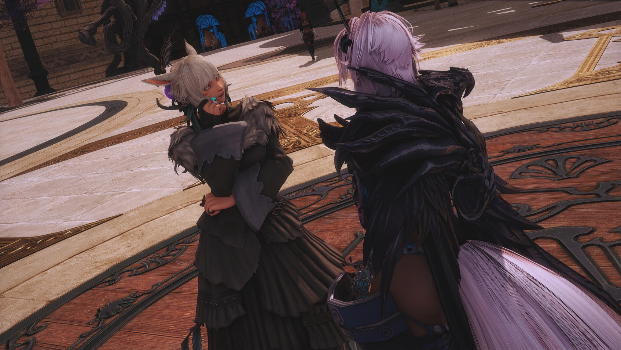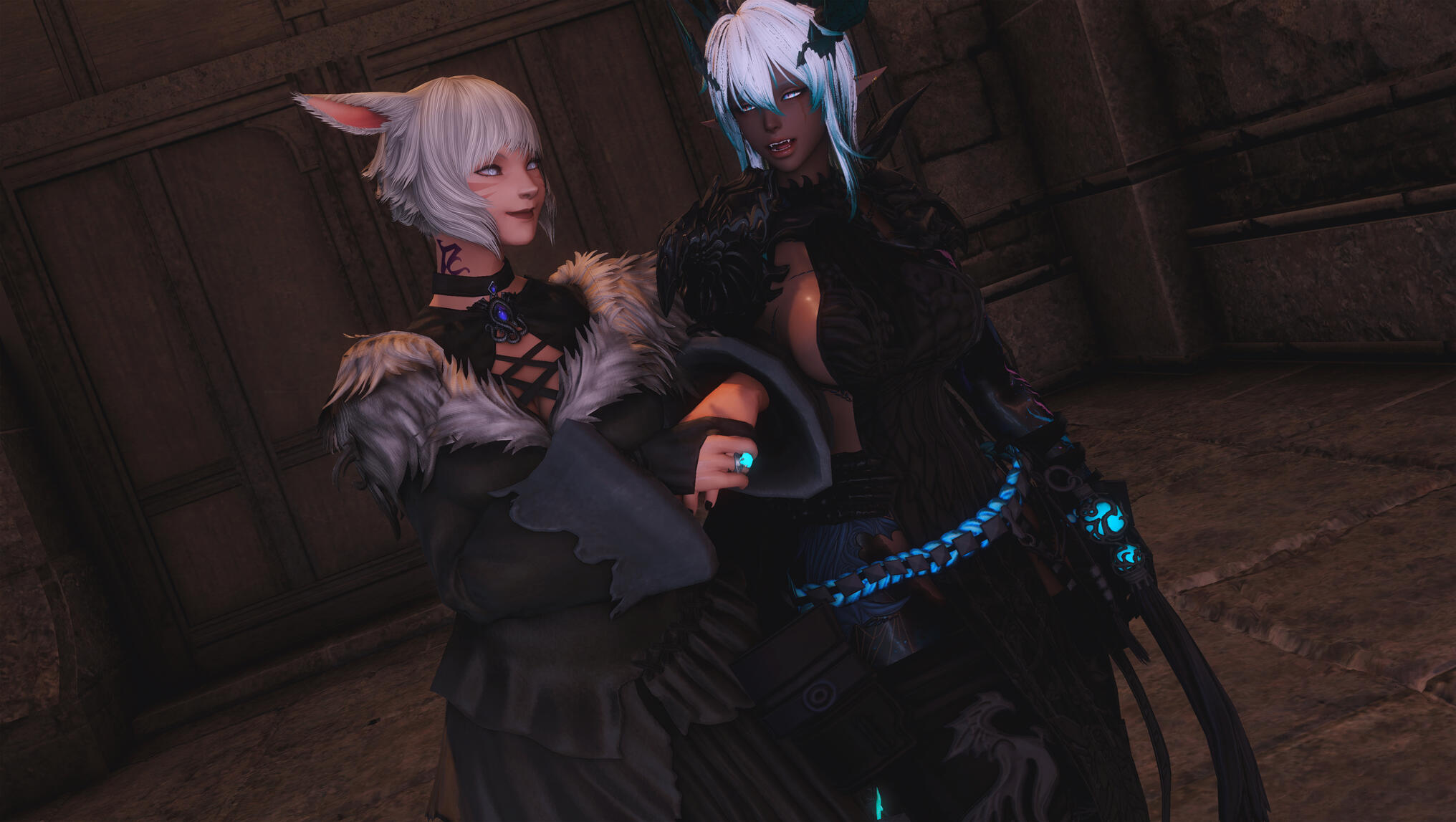 The next morning in Solution 9 dawned with a glittering neon haze, soft and slow, as though even the lights themselves knew what kind of night Aldra and Y’shtola had shared. Their clothing, torn and frayed from the frantic chase that had once been driven by obsession and fear, now served as reminders of a journey that ended not in ruin, but in clarity… and vows. Alisaie didn’t miss it. Alphinaud certainly didn’t.Still, Aldra walked with her head high, her tail brushing lightly behind her, and one hand resting at the small of Y’shtola’s back—protective, steady, proud. Y’shtola, in turn, stayed close, the faintest, satisfied curve to her lips, the kind that made Alisaie sigh through her nose but couldn’t quite scold. Not today.They stepped into the backroom of the Neon Stein, greeted at once by Alisaie. Alphinaud stood beside her, arms folded, his expression caught between relief and lingering distrust as he questioned Y’shtola about her motives—what, exactly, had made her so fixated on Aldra.Y’shtola lifted her chin.