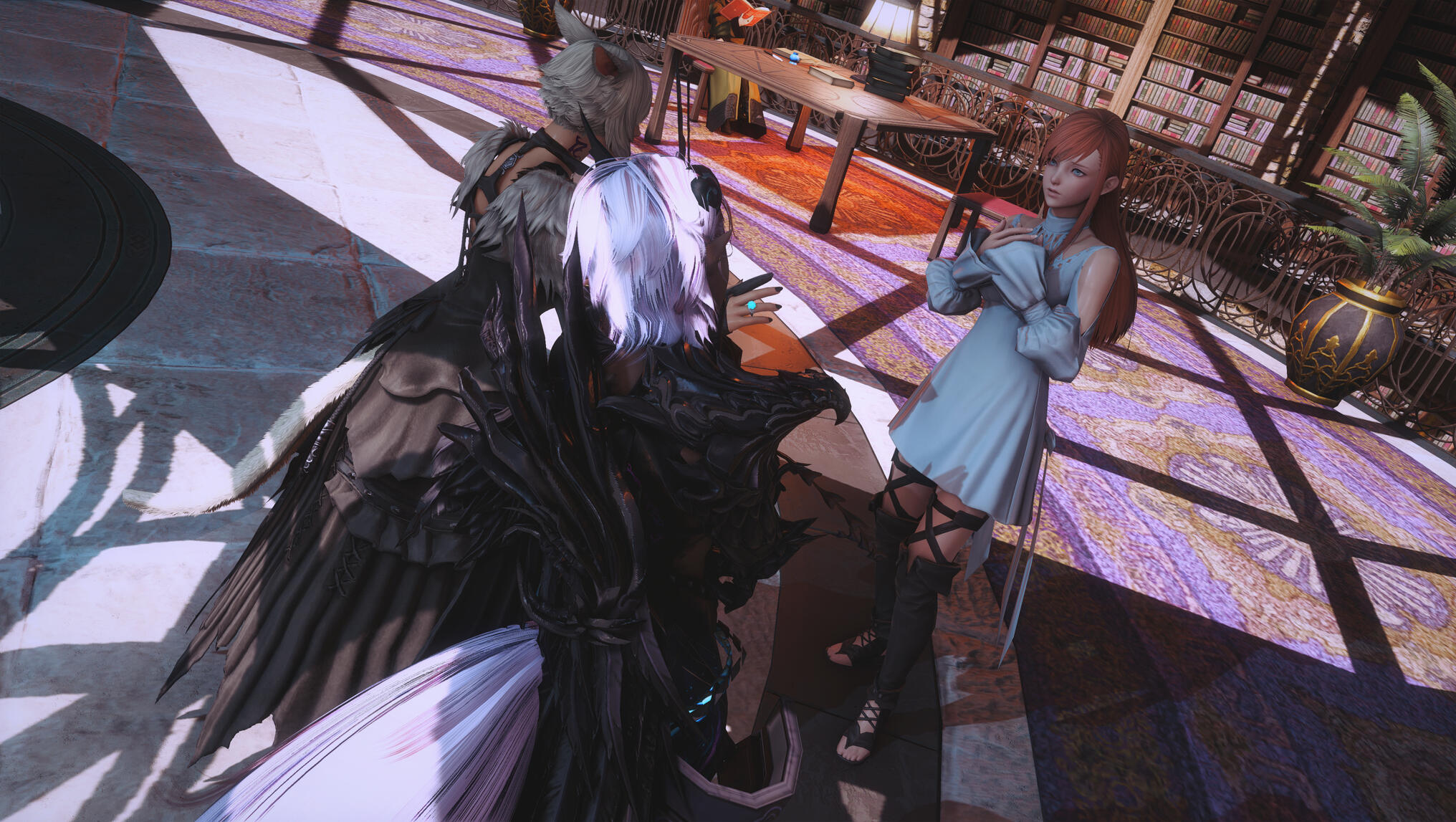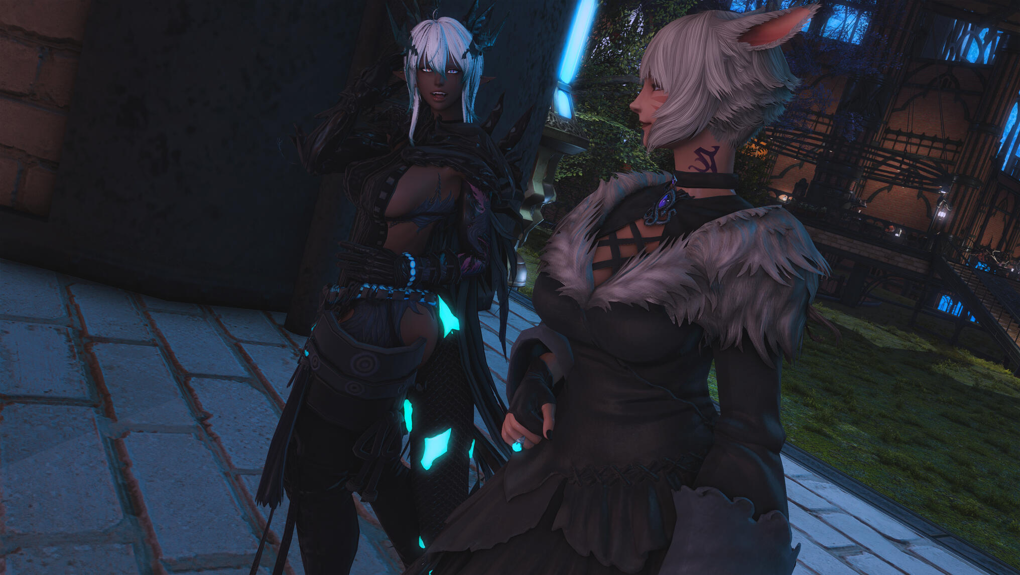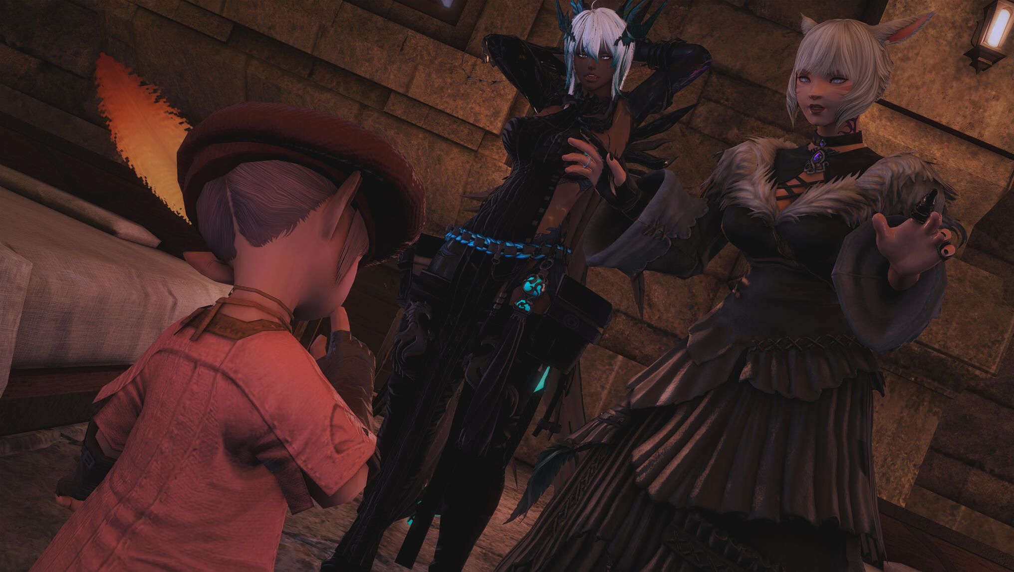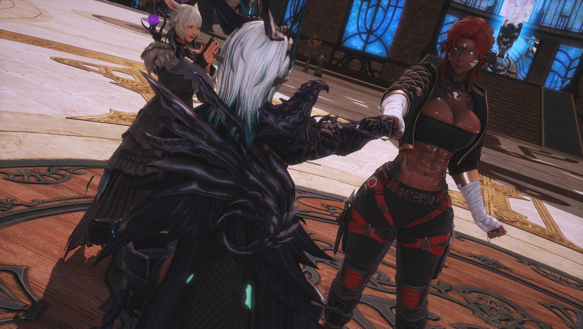 The next morning in Solution 9 dawned with a glittering neon haze, soft and slow, as though even the lights themselves knew what kind of night Aldra and Y’shtola had shared. Their clothing, torn and frayed from the frantic chase that had once been driven by obsession and fear, now served as reminders of a journey that ended not in ruin, but in clarity… and vows. Alisaie didn’t miss it. Alphinaud certainly didn’t.Still, Aldra walked with her head high, her tail brushing lightly behind her, and one hand resting at the small of Y’shtola’s back—protective, steady, proud. Y’shtola, in turn, stayed close, the faintest, satisfied curve to her lips, the kind that made Alisaie sigh through her nose but couldn’t quite scold. Not today.They stepped into the backroom of the Neon Stein, greeted at once by Alisaie. Alphinaud stood beside her, arms folded, his expression caught between relief and lingering distrust as he questioned Y’shtola about her motives—what, exactly, had made her so fixated on Aldra.Y’shtola lifted her chin.