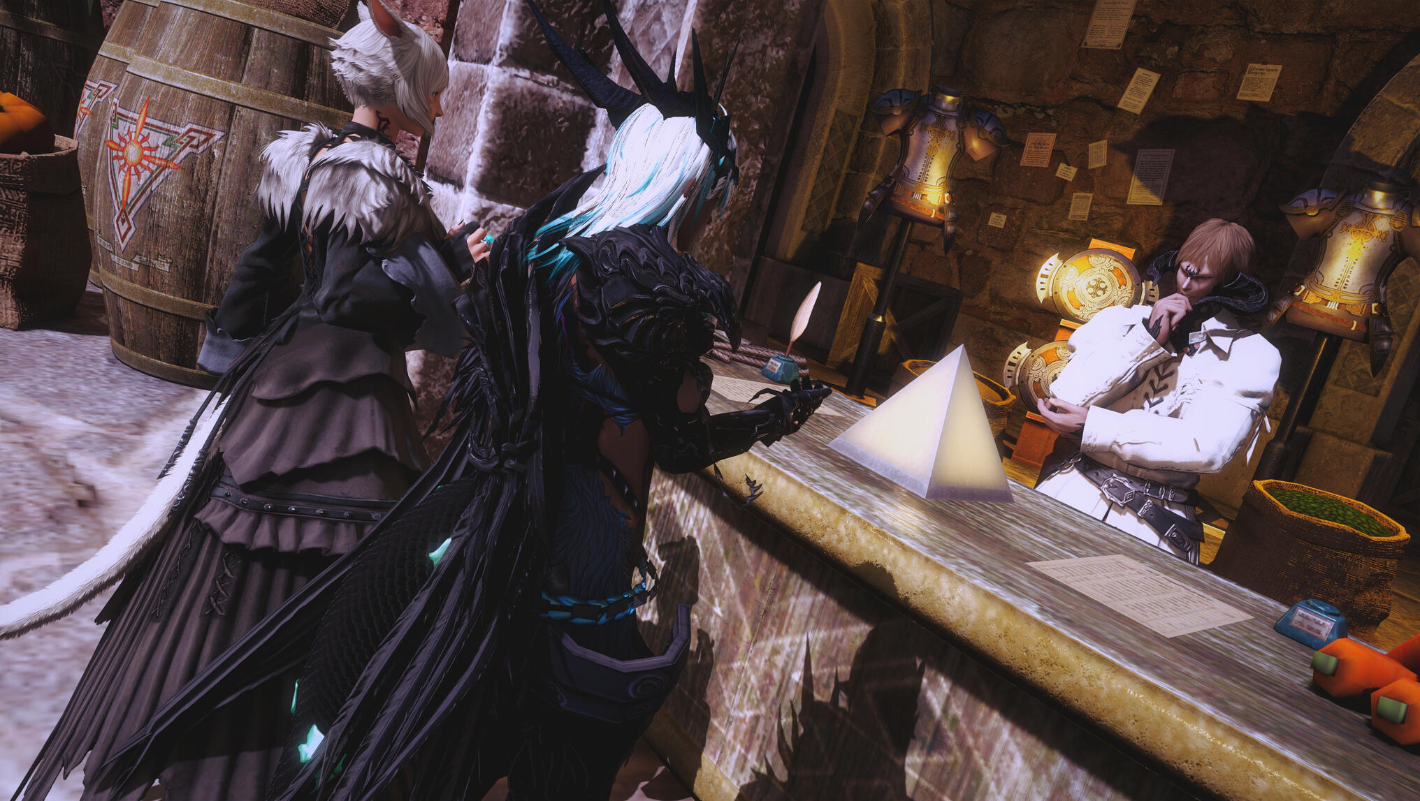 Y’shtola slowed beside her, tail swaying thoughtfully as her gaze traced the flow of aether threading through the city. Her eyes narrowed—not in concern, but in fascination—as she followed invisible currents curling around the floating ruins and down into the streets below. Aldra felt that familiar awareness stir between them, a quiet harmony born of shared magic and shared life. She knew what Y’shtola was thinking before the words were spoken.“This place is… balanced,” Y’shtola murmured at last. “Not untouched—but carefully maintained.”They began their work without ceremony.Together, they spoke with traders fresh off the docks, shopkeepers who had lived their entire lives beneath drifting stone, sailors bound for distant shores, and guards stationed near the keep. Their questions were gentle, precise—strangers with memories that did not belong to them, travelers who arrived knowing things they should not, people who felt displaced within their own skin.