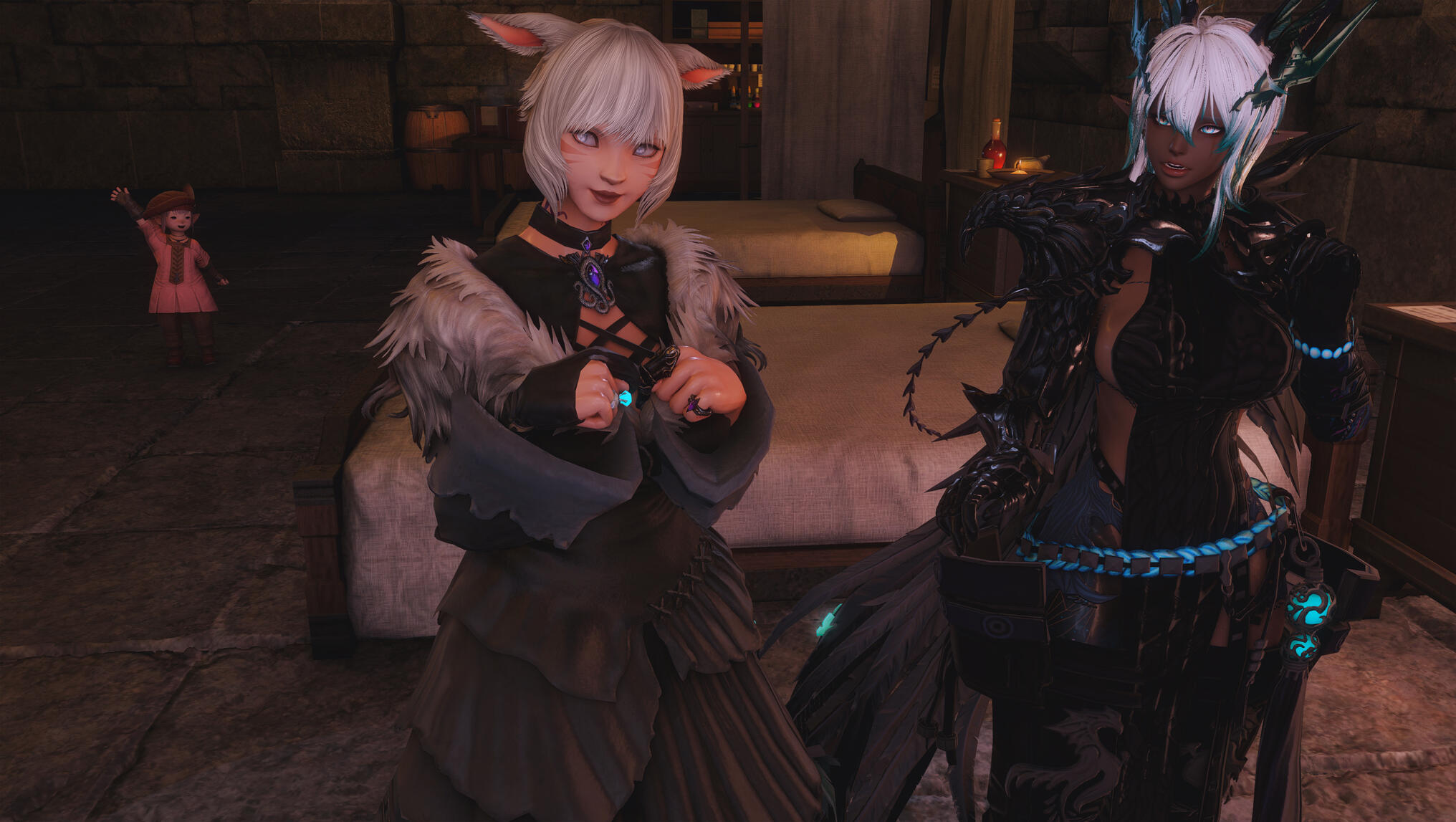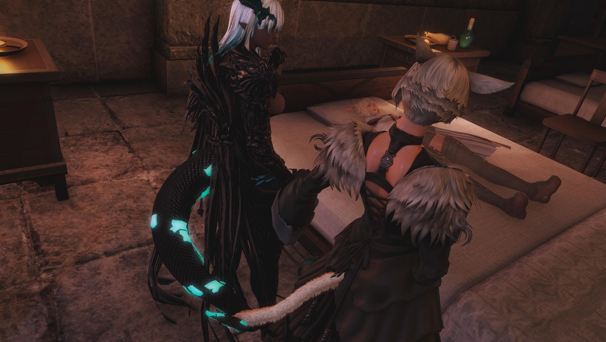 That night, Jeuno exhaled.The city’s ever-present hum softened into something almost reverent as lanterns dimmed and footsteps thinned along the stone paths. From the inn’s upper floor, the distant creak of docks and the murmur of the sea blended into a lullaby shaped by time and tide.Within the inn, Aldra slept deeply, the tension of the day finally released. Her breathing was slow and even, her body warm beneath the covers. Her tail curved instinctively toward Y’shtola, resting against her leg in a familiar, grounding touch. Y’shtola remained awake for a time, watching her wife with an expression she rarely allowed herself—unguarded, serene.She brushed her fingers through Aldra’s hair, tracing the gentle rise and fall of her chest, feeling an unexpected sense of completeness settle in her heart. For so long, her life had been defined by motion—research, duty, sacrifice, loss. Now, in this quiet space, she found she wanted nothing more than to remain exactly where she was. By Aldra’s side. Anchored. Content.Y’shtola allowed herself that quiet moment. To watch. To feel. To acknowledge the fragile miracle of now.Morning arrived without urgency.Sunlight spilled through the inn’s windows, pale and warm, catching on dark scales and pale fur alike. Aldra stirred first, blinking awake with a soft sound of contentment before smiling when she realized she hadn’t dreamed the closeness. They dressed slowly, unhurried, sharing glances and small touches that spoke more than words.