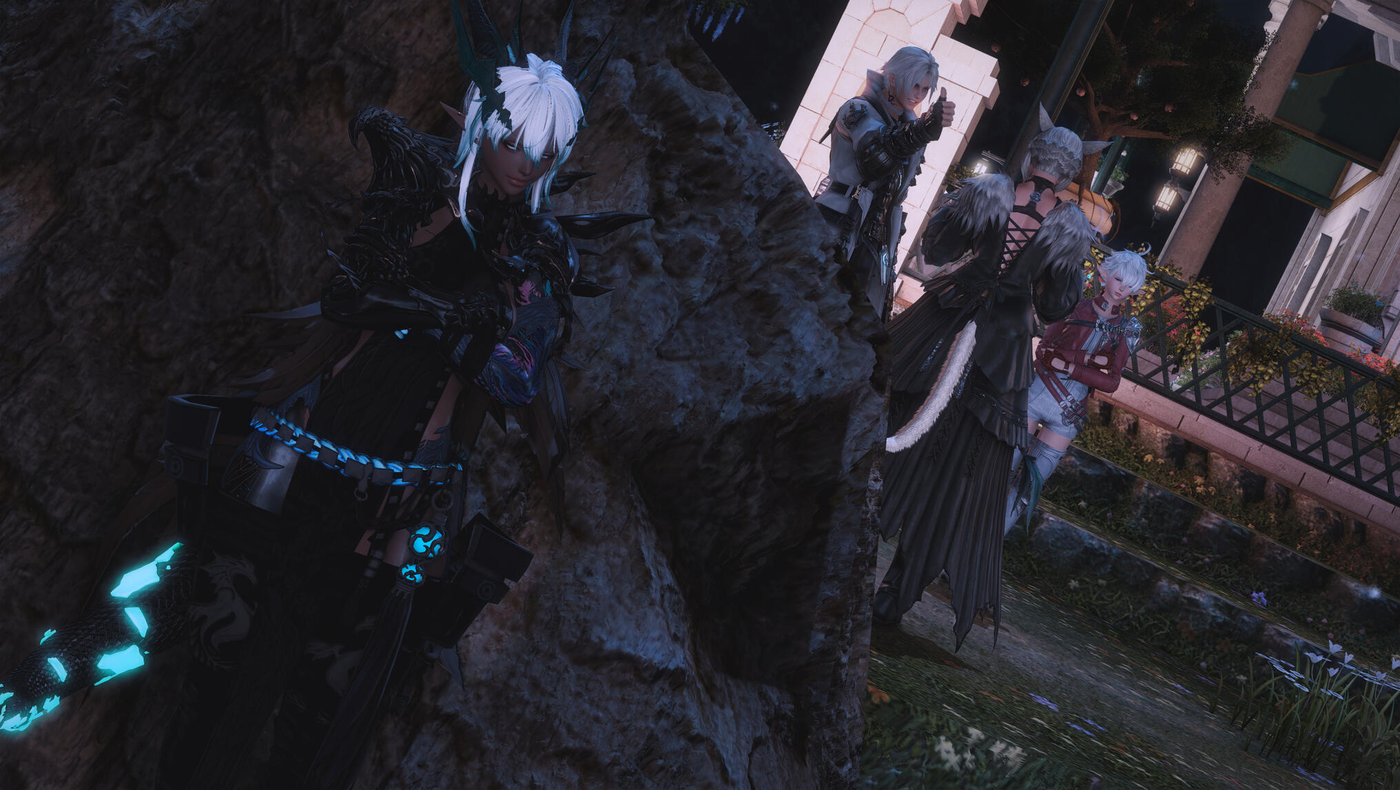 They reached the café as dusk settled fully into night, lanternlight pooling warmly along the stone paths of the Lavender Beds. The building glowed with life—soft laughter inside, the faint clink of cups and cutlery drifting through the open windows. It felt inviting. Ordinary. And that, somehow, made Aldra’s pulse race all the faster.She slipped instinctively into the shadows as Y’shtola moved ahead, her presence calm and composed as ever, though her tail flicked once in quiet alertness. Aldra lingered just out of sight, fingers curling into the fabric of her sleeves as she steadied her breathing.Before Y’shtola could reach the door, familiar voices cut through the night.“Well I’ll be damned,” Thancred said cheerfully, stepping into the light with an easy grin. “Y’shtola? Didn’t expect to see you here tonight.”Alisaie stood nearby, arms folded, her expression polite but sharp—eyes already searching Y’shtola’s face for answers that hadn’t yet been given.Y’shtola recovered smoothly, years of practiced composure guiding her words. “I heard Aldra’s café had finally opened,” she replied lightly. “I wouldn’t miss the chance to see her work—and sample the food. You know how fond I am of her cooking.”